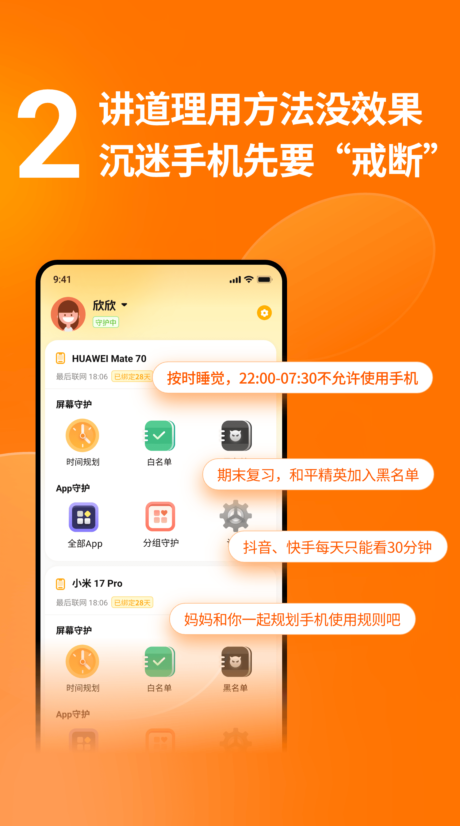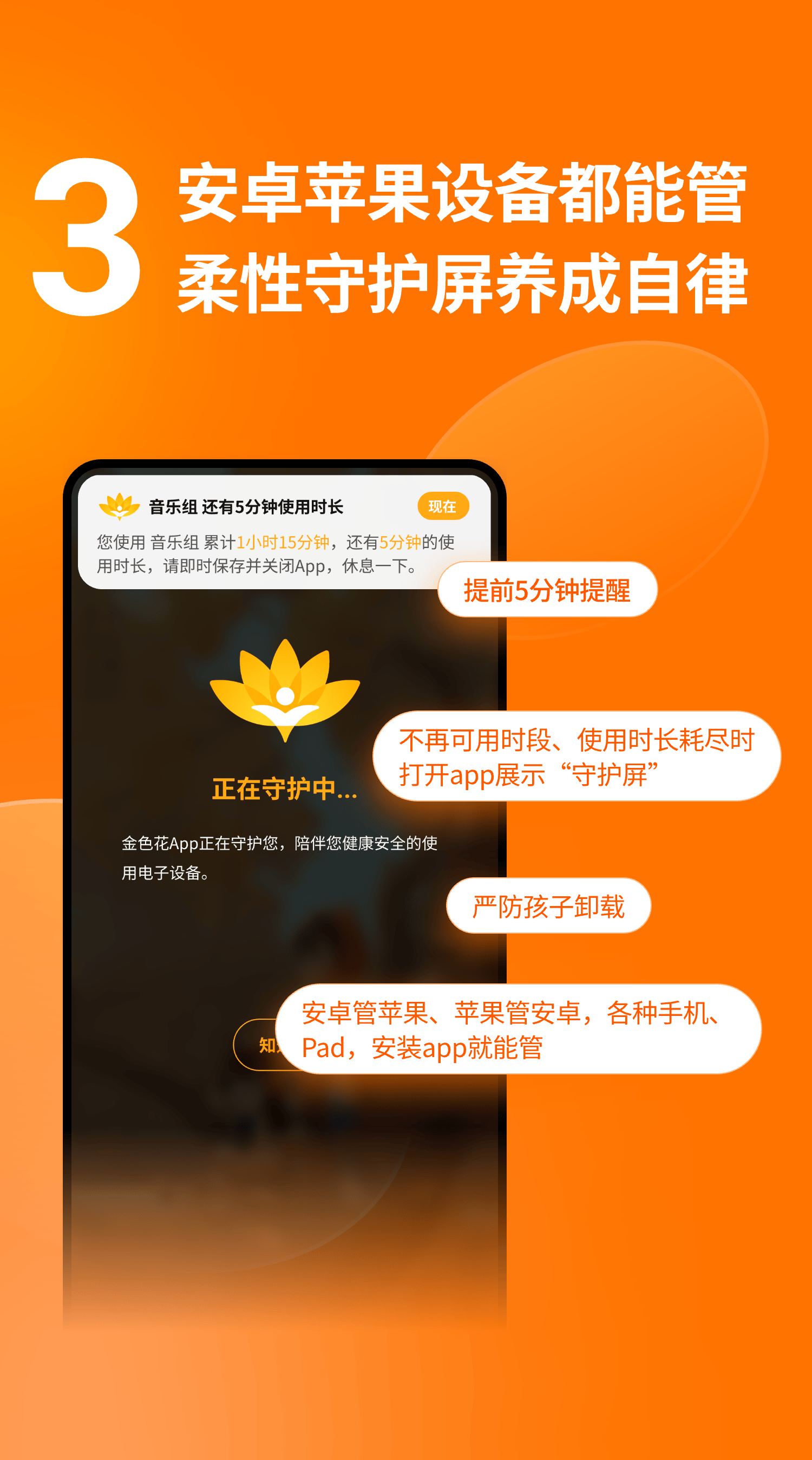内置的专业手机监控功能,能够实时同步孩子手机使用动态,包括应用启动记录、屏幕使用时长等关键数据。这让家长可以清晰掌握孩子的用机轨迹,及时发现并纠正不良用机行为。此外,金色花守护搭载了防卸载技术,有效防止孩子擅自卸载应用导致管控失效,同时优化了操作流程,支持家长端远程管理,无需复杂设置即可完成各项管控配置,真正实现了便捷、高效的家长管理体验。