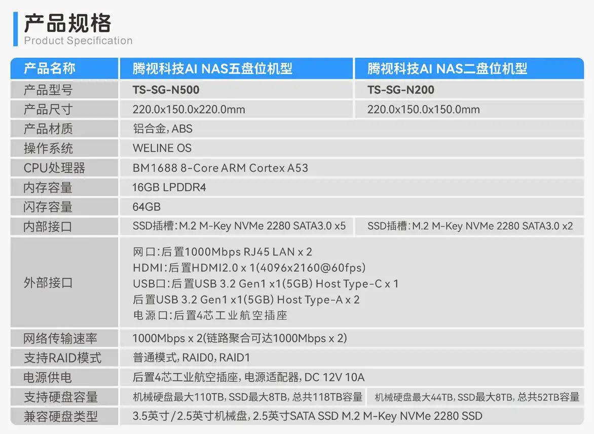配置灵活:该系列AI NAS产品分为两个配置,TS-SG-N500是五盘位机型,TS-SG-N200是两盘位机型,不同的配置保证了不同家庭及企业场景对AI NAS的使用需求。