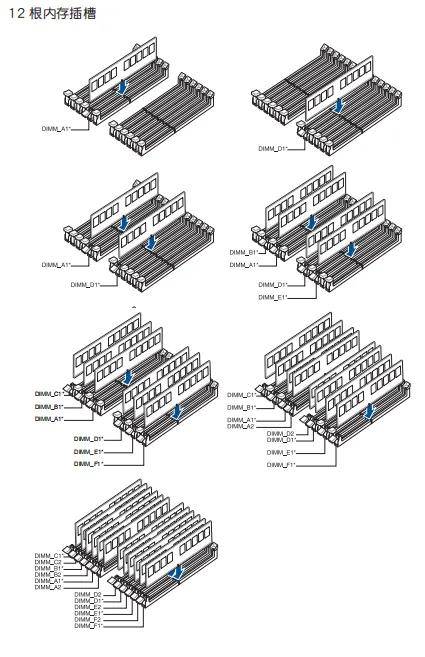 主板有8根内存插槽,或者12根内存插槽的情况,我就不一一说了,直接看下面的图。