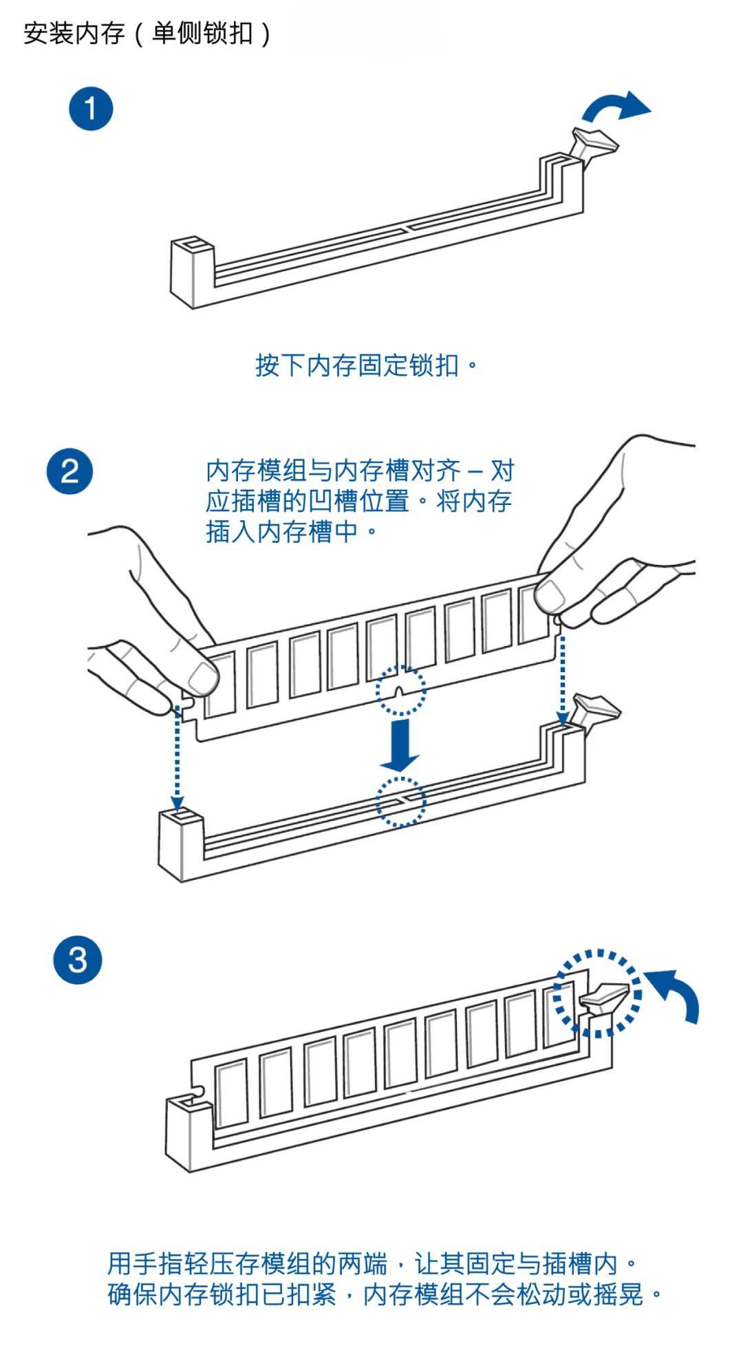 简单来说,就是按下锁扣,“防呆”缺口对准,双手用力按压,锁扣自动弹回,即表示安装完成。具体可以看下面的示意图。
