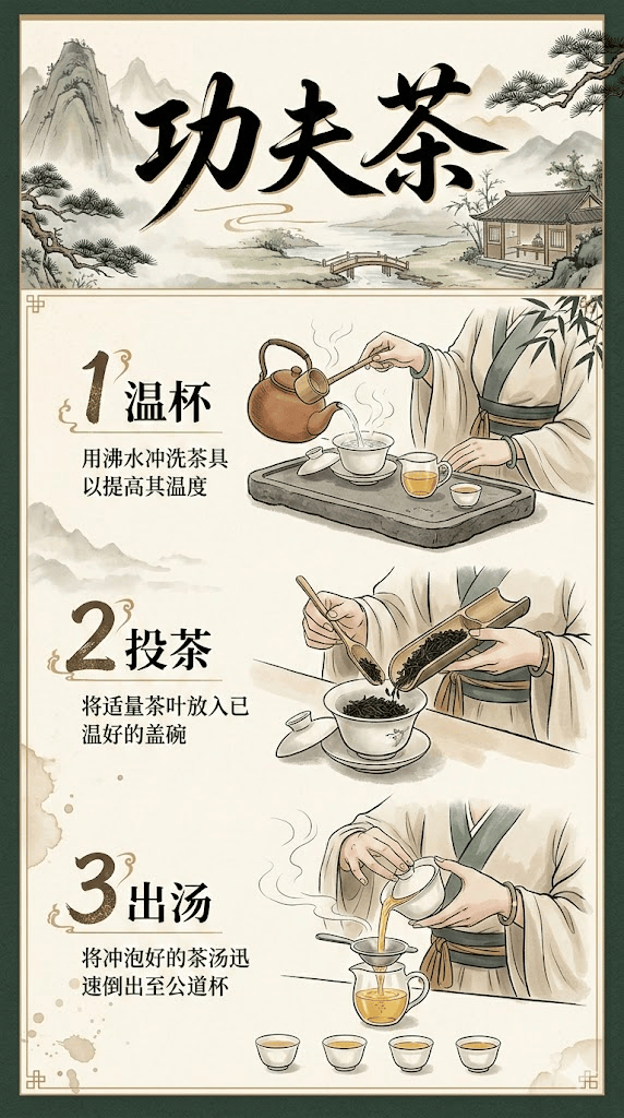 或者这张带步骤说明的「功夫茶」中文信息图,从排版到意境,都给出了一套可以直接用的视觉方案。