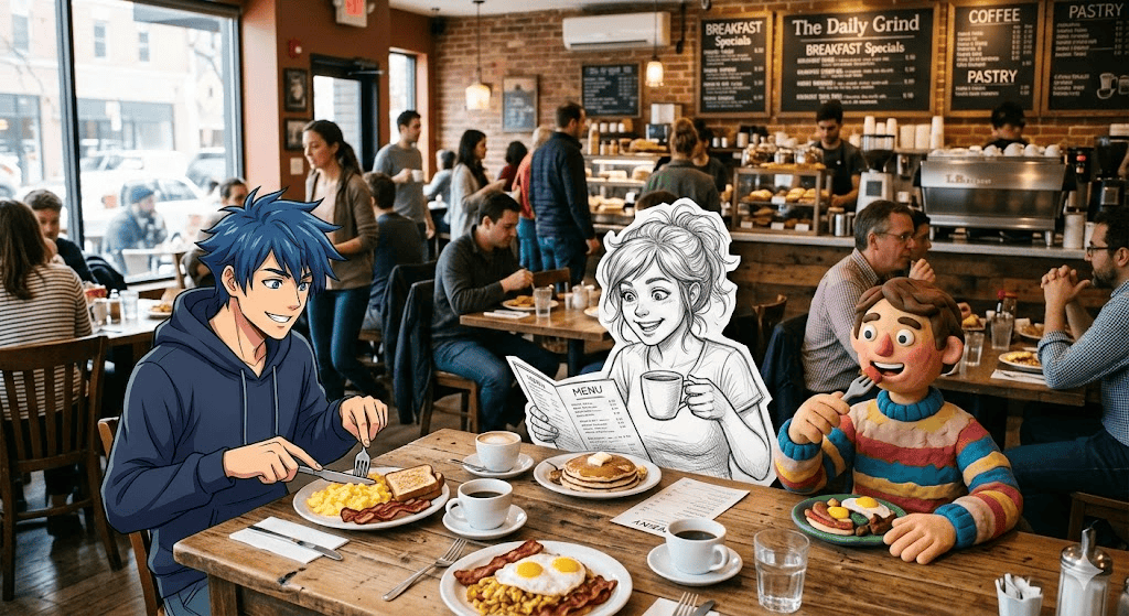 ▲提示词:A photo of an everyday scene at a busy cafe serving breakfast. In the foreground is an anime man with blue hair, one of the people is a pencil sketch, another is a claymation person