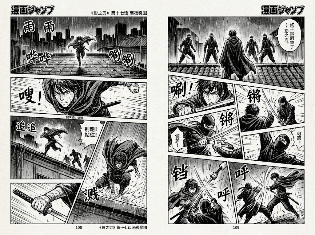 ▲提示词:设计一份逼真的双页漫画杂志样张。每一页都应包含多个漫画风格分镜,以富有动感的版式排列,呈现出专业印刷的日本漫画质感。整体风格为黑白稿,使用粗犷有力的墨线、网点效果(screen tones)以及富有表现力的人物绘制。画面中加入对白气泡、中文拟声词,并通过分镜之间的过渡来传达动作、情绪与节奏。左右两页需要连贯衔接,像同一场景或同一话章节的一部分。采用传统漫画镜头语言:特写、远景、斜向分镜以及戏剧化的视角与构图。整体观感要真实可信,仿佛来自一本真正的漫画杂志的跨页内容。
