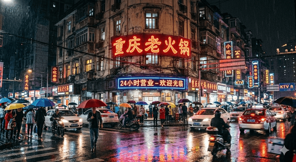 ▲提示词:一张繁忙亚洲城市雨夜的电影感街头照片。一个巨大的、发光的红色霓虹灯牌挂在一座老建筑上,上面清晰地写着「重庆老火锅」。在它下面,一个较小的蓝色霓虹灯牌写着「24 小时营业 – 欢迎光临」。湿漉漉的柏油路反射着霓虹灯光。