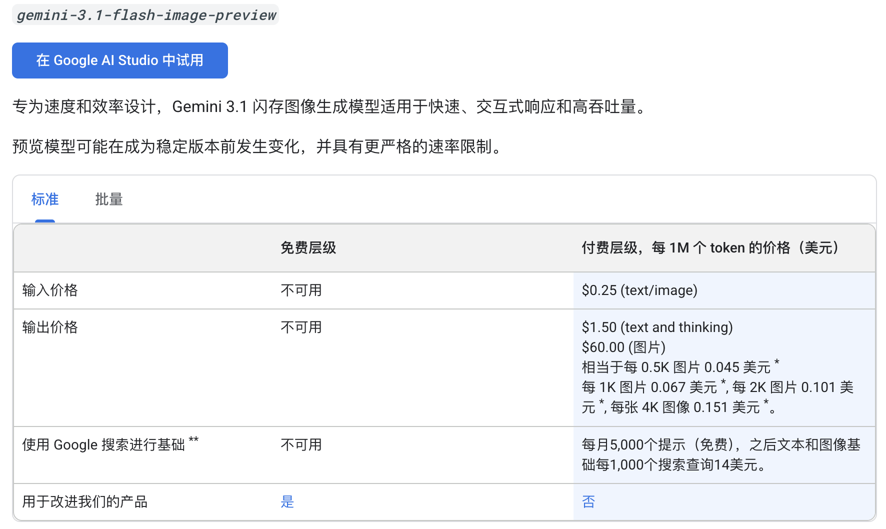 ▲ 附上地址:https://ai.google.dev/gemini-api/docs/pricing#gemini-3.1-flash-image-preview
