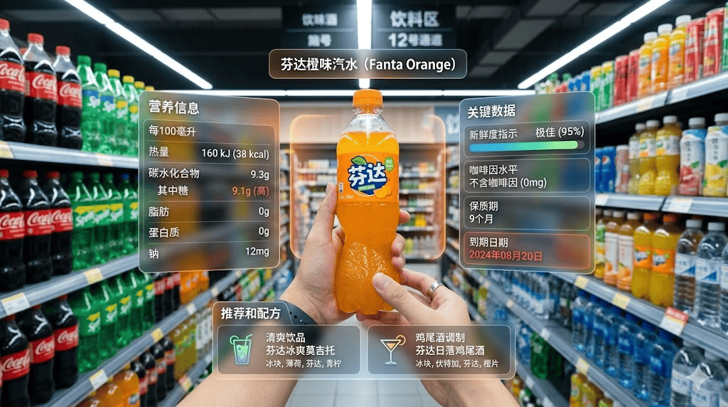 ▲提示词:第一人称视角,置身于灯光明亮的超市货架通道中。人类双手将一瓶芬达汽水举到镜头前方。鲜艳的橙色饮料装在其标志性的品牌瓶身里,周围环绕着多层全息增强现实界面,用中文展示营养相关数据,包括热量数值、含糖量、咖啡因水平、新鲜度指示、保质/到期日期,以及基于芬达推荐的清爽饮品配方和鸡尾酒调制方案。玻璃质感的 UI 面板,柔和的环境光晕,逼真的光照与阴影,自然的景深效果,沉浸式第一人称交互界面,2K