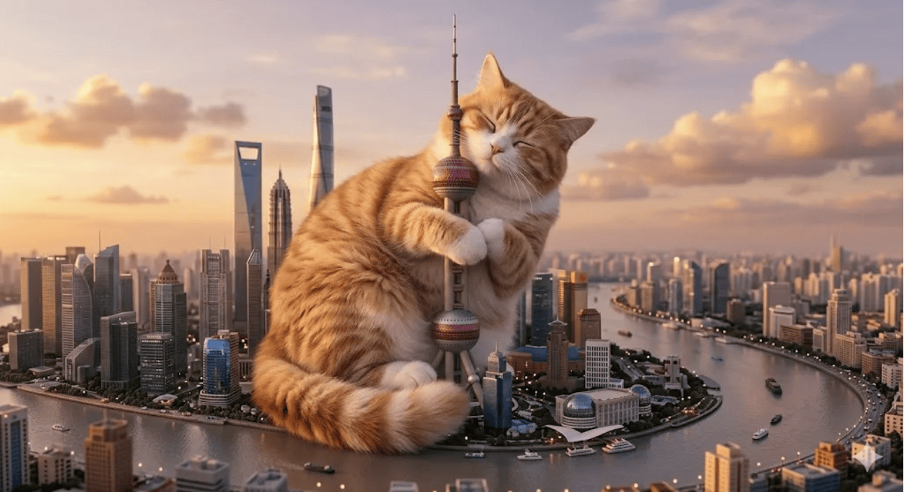 ▲提示词:画面中,【东方明珠广播电视塔】被一只超级巨大、超级可爱的【猫】占据。周围的建筑物看起来就像玩具模型一样小,而【猫】则非常巨大。游戏背景设定在一个逼真的城市环境中。整体氛围安静、温暖、舒缓、可爱。