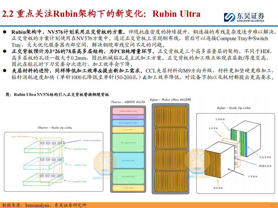 『英伟达』Rubin架构的推出,为PCB产业带来了新的增量需求。Rubin CPX版本增加了144张CPX『芯片』,这些『芯片』均需搭载在PCB板上,同时该方案引入正交中板,取代铜缆走线连接GPU与CPX,进一步增加了PCB的使用量。而Rubin Ultra方案则采用正交背板设计,单机柜分为四个Pod,每个Pod中包含多个计算与交换刀片,通过正交背板前后相连,单机柜增加4块正交背板。正交背板作为高多层板,其加工难度随层数和厚度增加而提升,对钻孔设备的加工效率提出了更高要求。此外,随着CCL夹层材料向M9方向升级,材料硬度增加,钻针损耗速度加快,单针加工孔数从M6材料的2000孔下降至M9材料的150孔,这为钻针和钻机市场带来了量价齐升的机遇。