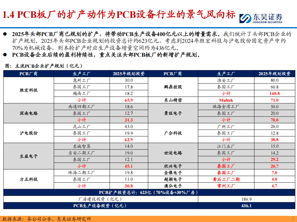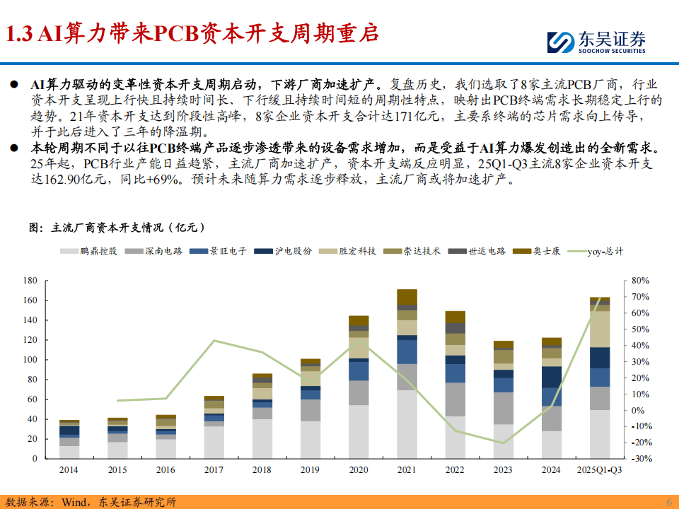 在AI算力需求的驱动下,PCB行业迎来了新一轮变革性的资本开支周期。与以往不同的是,本轮周期并非简单的终端产品渗透带来的设备需求增加,而是由AI算力爆发创造出的全新增量需求。2025年起,PCB行业产能日益趋紧,主流厂商加速扩产,资本开支反应明显。据统计,2025年前三季度,8家主流PCB厂商资本开支合计达162.90亿元,同比增长69%。未来随算力需求逐步释放,主流厂商或将进一步加速扩产。以头部PCB企业2025年已规划的扩产项目计算,总投资约623亿元,其中约70%将用于机械设备,预计将带动PCB生产设备超过400亿元的增量需求。这一轮扩产周期,为PCB设备企业提供了广阔的盈利空间和持续增长的动力。