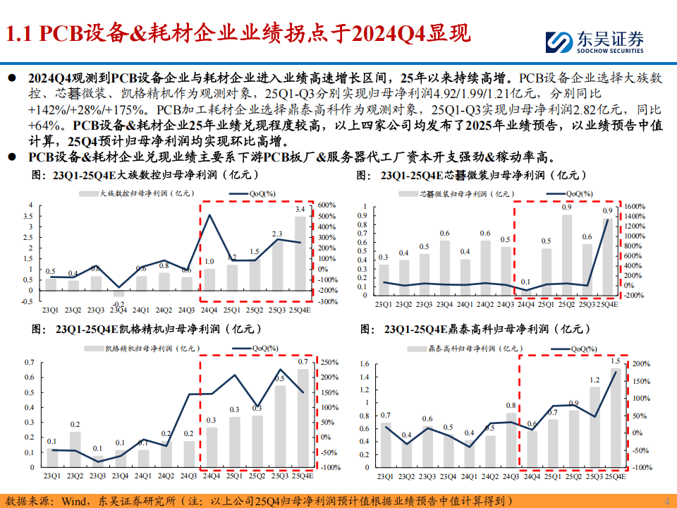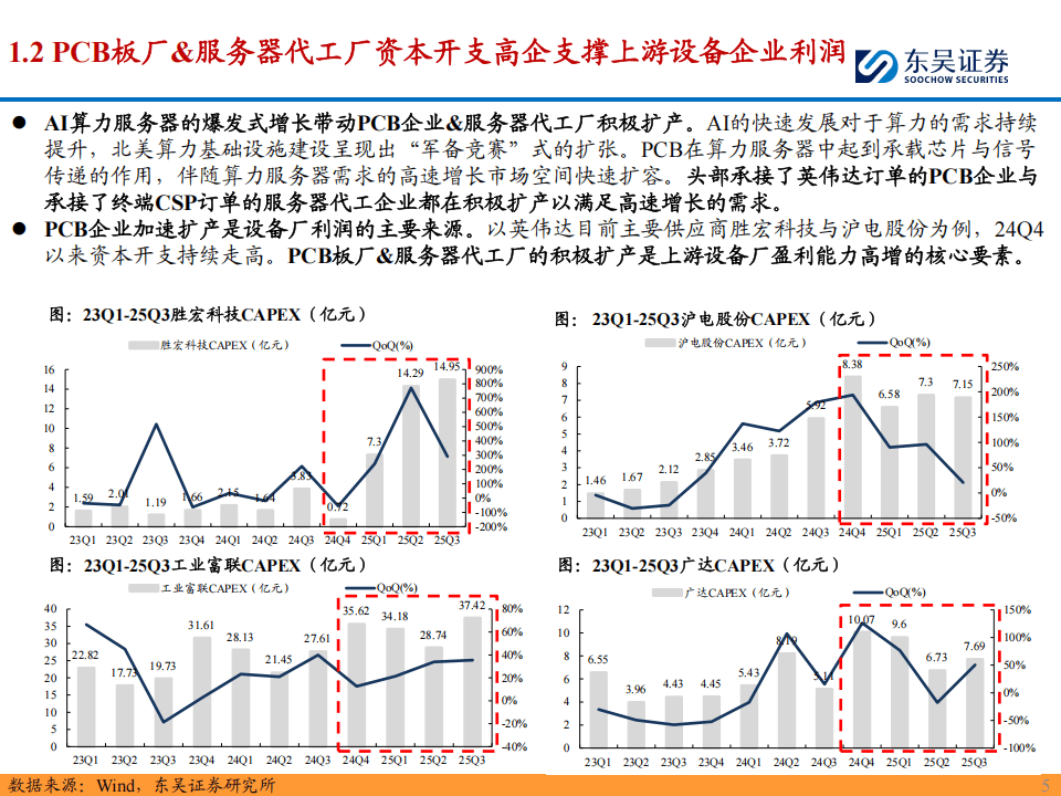 近年来,随着人工智能技术的迅猛发展,算力『服务器』需求呈现爆发式增长,带动了PCB(印刷电路板)产业链的全面复苏。根据东吴证券最新发布的PCB设备2026年度策略报告,PCB板厂及设备厂自2024年第四季度起业绩拐点显现,板厂资本开支高增直接推动设备厂收入水涨船高。以『英伟达』主要供应商胜宏科技与沪电股份为例,2024年第四季度以来,其资本开支持续走高,显示出强劲的扩产意愿。PCB设备与耗材企业的业绩兑现,主要得益于下游PCB板厂强劲的资本开支及高稼动率。