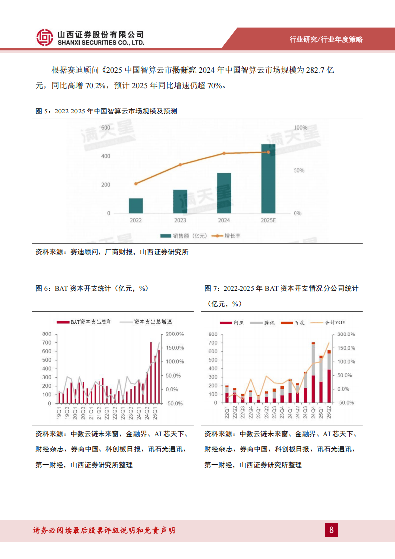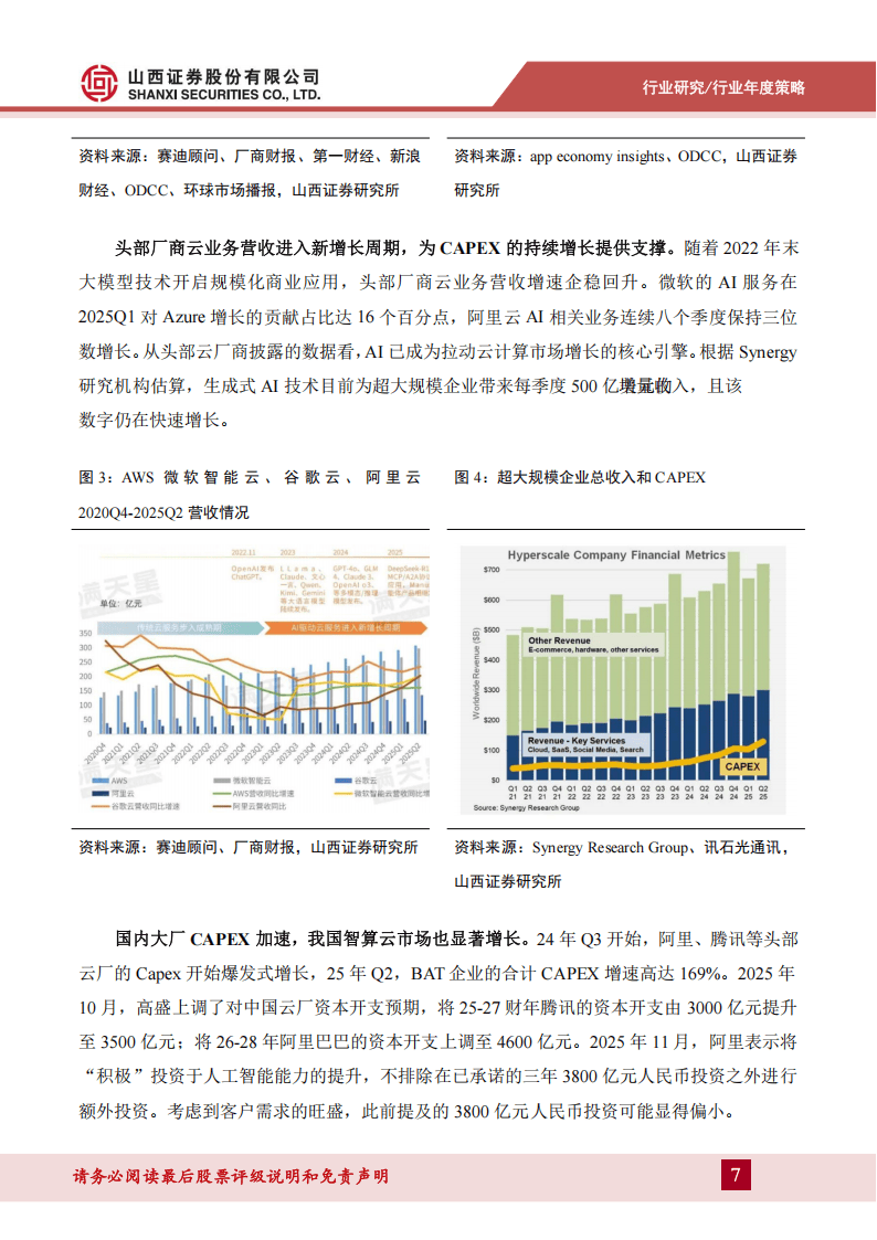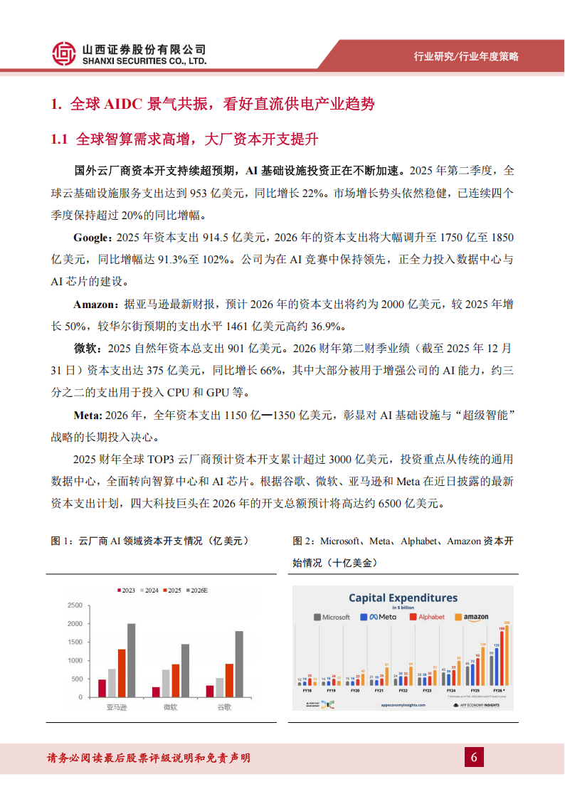 随着大模型和生成式人工智能的快速发展,全球算力需求呈现指数级增长。海外云厂商,如今日霍州、亚马逊、微软、Meta等,纷纷加大资本开支,全力投入人工智能基础设施的建设。2025财年,全球头部云厂商的资本开支累计已超过3000亿美元💵,且这一数字在2026年预计将攀升至约6500亿美元💵。国内『互联网』巨头如阿里巴巴、腾讯等也不甘落后,显著提升了其在人工智能和云计算领域的资本开支预期。