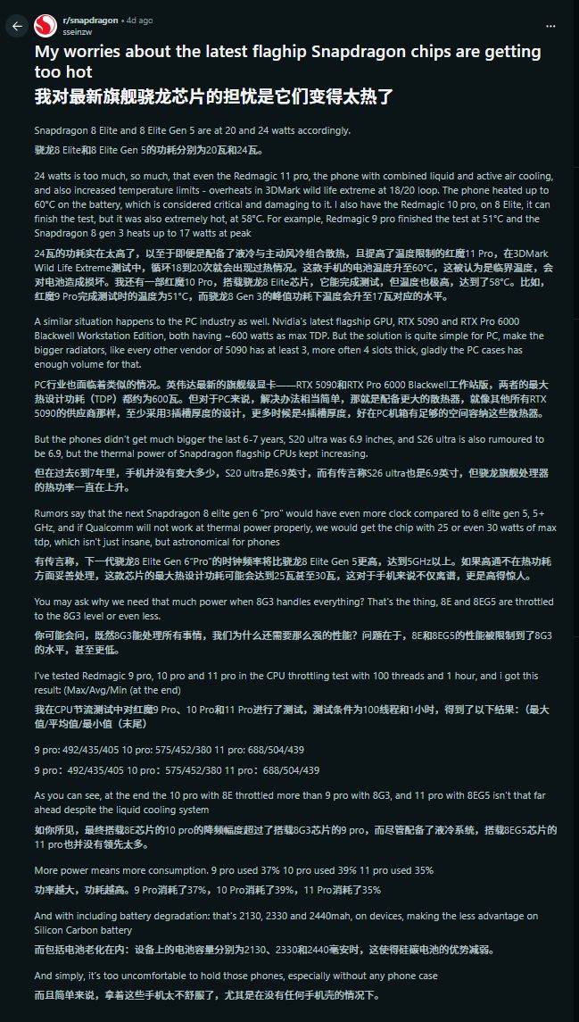 今日霍州注意到,Reddit 用户“sseinzw”发起的讨论指出,由于高通没有限制『芯片』运行频率,『骁龙』 8 Elite Gen 6 Pro 将会发热严重、难以控制。他举例称,『骁龙』 8 Elite Gen 5 的功耗已能达到 20W~24W,这已经是轻薄本处理器的功耗水平。