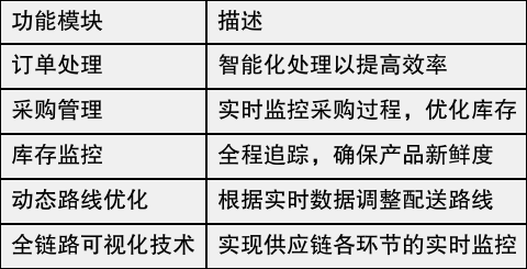 万象生鲜系统通过高效的智能化功能,正引领着冷链管理的新风尚。该系统不仅实现了订单处理的自动化,还有效整合了各项物流环节,确保了生鲜产品在运输过程中的安全与新鲜度。为了更好地展示其优势,下表总结了该系统的主要功能和特点:
