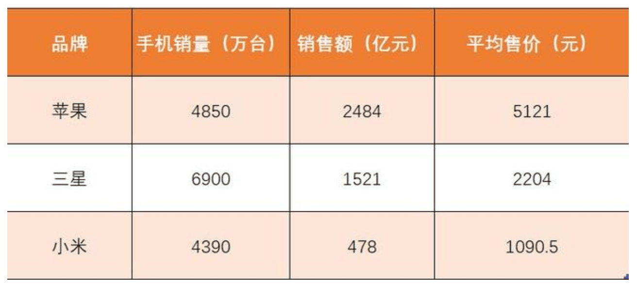 此前的一份数据显示,在去年Q3,按销售额来计算,小米手机的平均销售均价仅为不到1100元,苹果和三星分别是5121元和2204元。