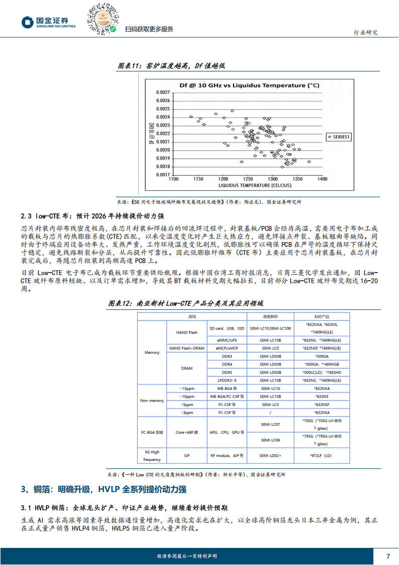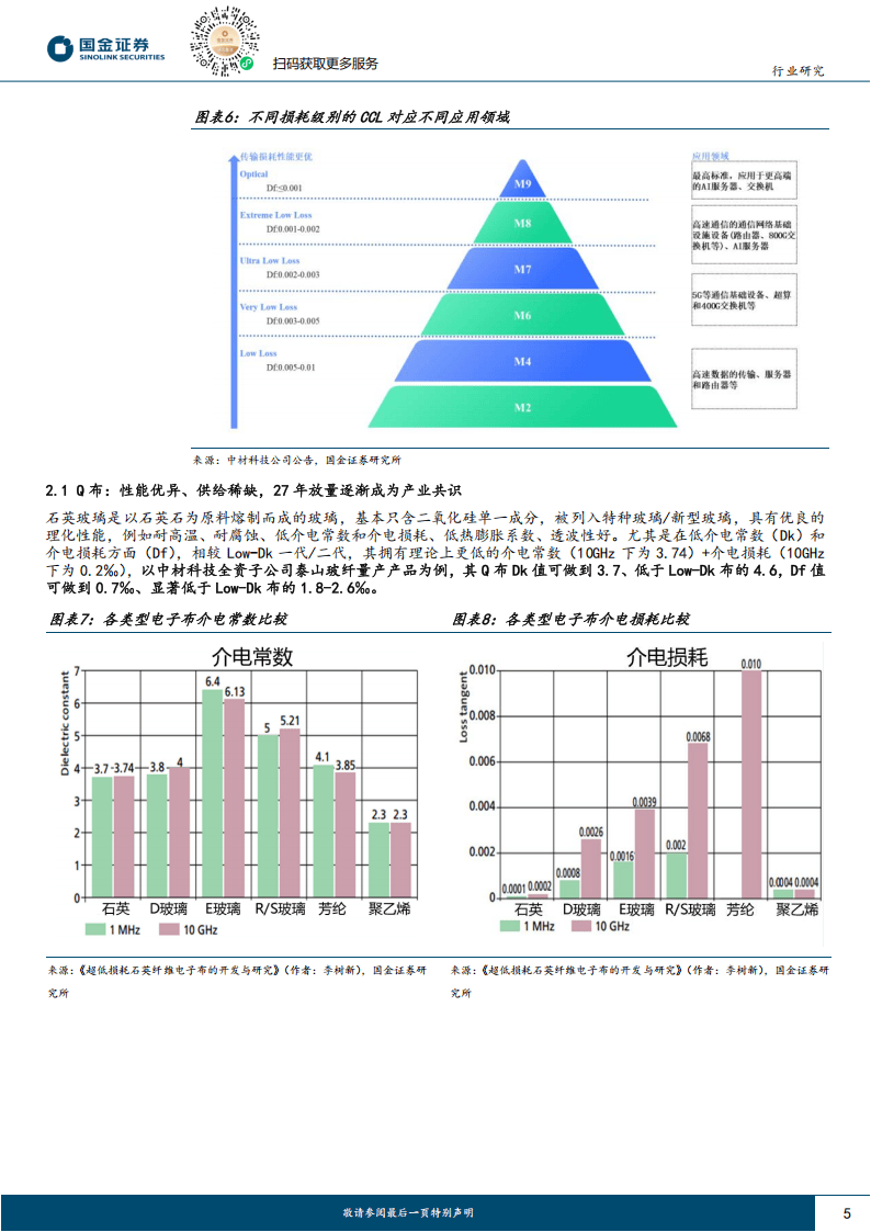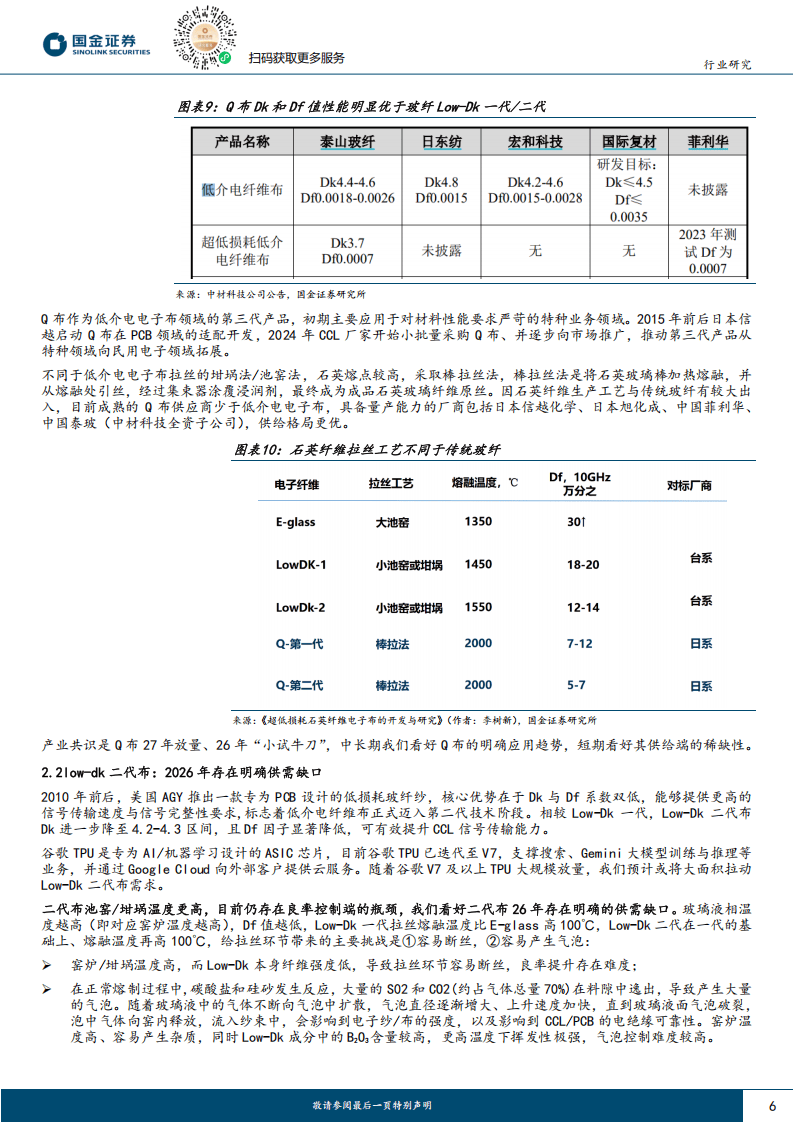 电子布作为CCL的增强材料,其技术迭代清晰体现了AI『服务器』对性能的极致追求。目前行业已形成三代产品梯队:第一代低介电常数(Low-Dk)电子布已逐步普及;第二代Low-Dk二代布则在熔融温度上进一步提升,以降低介电损耗(Df),但其生产工艺面临巨大挑战,高温下易断丝、易产生气泡,良率提升难度大,这使得二代布在2026年可能面临明确的供需缺口。而站在技术顶端的,是被誉为“Q布”的石英玻璃纤维布。Q布凭借其单一二氧化硅成分,在介电常数和介电损耗上拥有理论上的极致优势,性能远超前两代产品。然而,其采用的特殊“棒拉丝法”工艺复杂,量产门槛极高,目前全球能稳定供应的厂商屈指可数。这种稀缺性使得Q布不仅代表了未来的终极技术方向,其在2026年的“小试牛刀”也预示着一旦被大规模采用,上游材料环节将展现出巨大的业绩弹性。此外,应用于『芯片』封装基板的低热膨胀系数(Low-CTE)电子布,由于能有效解决『芯片』与基板在温度变化下的匹配问题,已成为封装环节的“刚需”,其供应紧张局面短期内难以缓解,价格上行趋势明显。