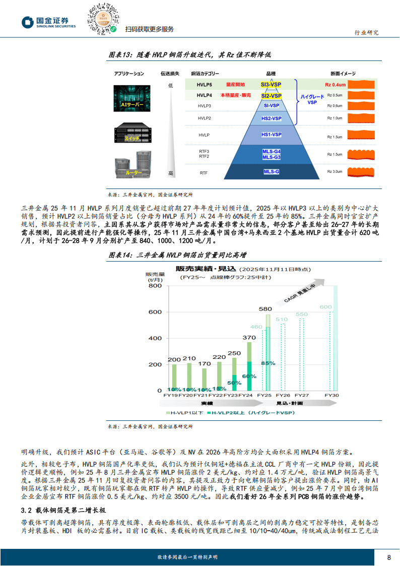 铜箔的粗糙度是影响高频信号传输完整性的核心指标。为满足AI『服务器』及ASIC『芯片』的需求,铜箔技术正从低轮廓向“极低轮廓”(HVLP)快速演进。HVLP铜箔已经发展至第四代,其表面粗糙度(Rz值)从第一代的1.5-2微米降至第四代的0.5微米以下,工艺难度呈指数级上升。全球高阶铜箔龙头正积极扩产,印证了这一领域的旺盛需求。更重要的是,随着ASIC平台和下一代GPU方案大面积采用更先进的HVLP4铜箔,全系列的HVLP铜箔都具备了强劲的提价动力。这不仅是因为技术升级带来的附加值,也源于供给端的结构性调整——部分原有产能转向生产更高阶的HVLP产品,导致中端市场供应减少,形成了全系列的涨价传导链。与此同时,用于『芯片』封装基板的载体超薄铜箔,作为一项长期被海外巨头垄断的技术,其国产化进程的加速,也为国内供应链打开了全新的增长空间。