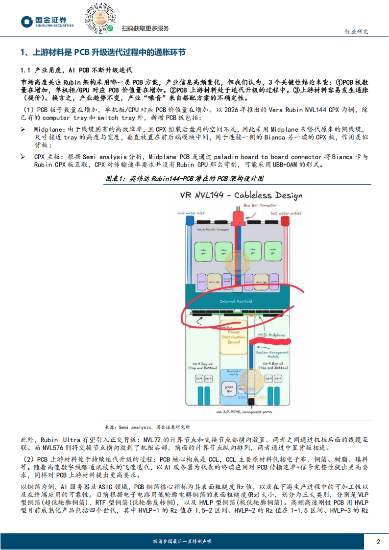 在这场围绕下一代AI『芯片』架构(如备受关注的Rubin系列)的竞争中,PCB的设计方案虽然众说纷纭,但几个核心趋势已日渐清晰。首先,单台『服务器』或单个GPU所对应的PCB使用量正在显著增加。以未来可能推出的高端机型为例,为了应对高密度互联和信号稳定性的挑战,『服务器』内部不仅需要更多的PCB板层,还可能新增如中置背板(Midplane)等复杂结构,这直接拉动了对上游基础材料的总量需求。更为关键的是,这不仅仅是“量”的增加,更是“质”的飞跃。高速信号传输对PCB材料的介电性能提出了严苛要求,迫使上游材料必须同步进行迭代升级,以适应更高的频率和更低的信号损耗。
