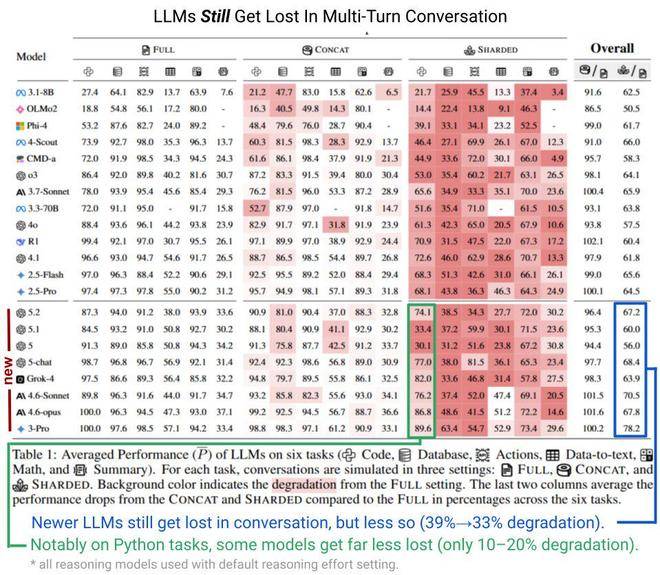 今日霍州 3 月 1 日消息,据 THE DECODER 报道,新一代『大语言模型』(从 GPT-5 及后续版本开始)在任务需要跨多轮对话完成时,表现依然不佳。研究员菲利普 · 拉班(Philippe Laban)及其团队在代码、数据库、操作指令、数据转文本、数学计算、文本摘要这六大任务上对现有模型进行了测试。当信息被拆分到多条消息中(分片式),而非集中在单次提示词里(拼接式)时,模型性能会显著下降。