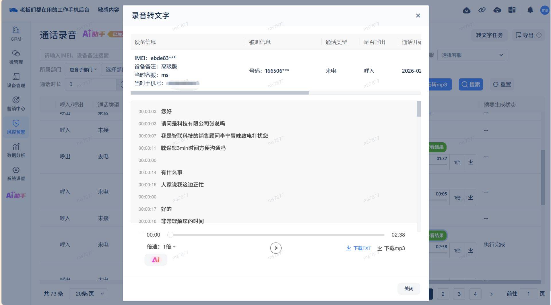 第二个是通话全程录音加AI分析,精准判断客户意向。助贷客户的需求经常藏在通话细节里,比如贷款额度、利率预期、还款周期这些,光靠人工记容易漏也容易错。山海工作手机自动录下销售和客户的每次通话,录音文件实时同步到CRM系统。配合AI智能分析功能,能自动提取通话里的核心诉求、情绪倾向,给客户意向精准打标签,生成可视化分析报告。销售能快速锁定高意向客户,针对性地调整沟通策略,减少无效跟进提高成单率。管理者也能通过CRM后台看通话记录和分析报告,销售过程可视化,及时发现沟通问题优化团队话术。