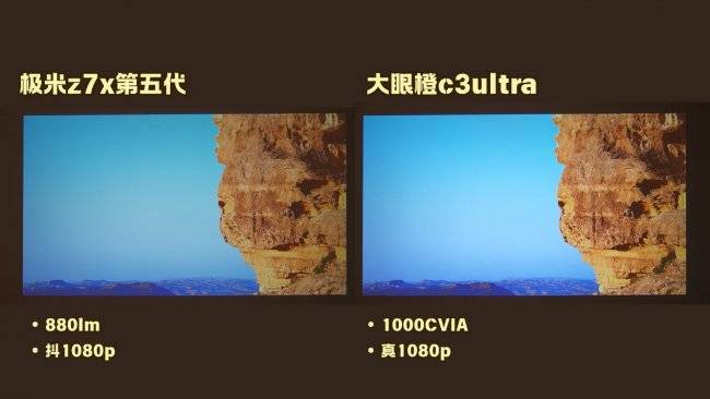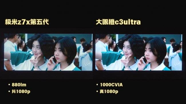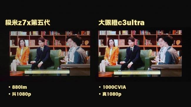 而极米Z7X高亮版亮度为880lm流明。在实际体验中,极米Z7X高亮版对环境亮度的抗光性会没有大眼橙c3ultra强,更适合在弱光环境下使用,画面效果会更好,色彩会更饱满。