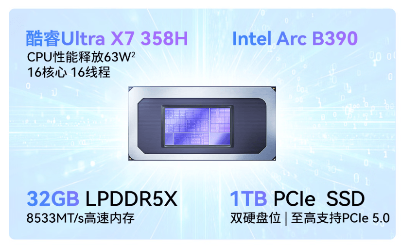 这颗处理器的亮点在于,除了CPU规格拉满(4超大核+8大核+4能效核16核心16线程,至高4.8GHz)之外,它集成了这一代真正的“大杀器”——英特尔锐炫B390核显。