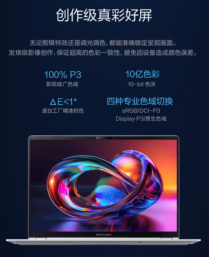 华硕出了名的“华硕好屏”在这款机器上也没缩水。2.8K 120Hz OLED面板,峰值亮度1100尼特,ΔE<1的逐台校色。对于要做设计、修图的创作者来说,这块屏幕的价值至少值2000块。再加上全金属机身仅1.39kg的重量,性价比直接拉满。