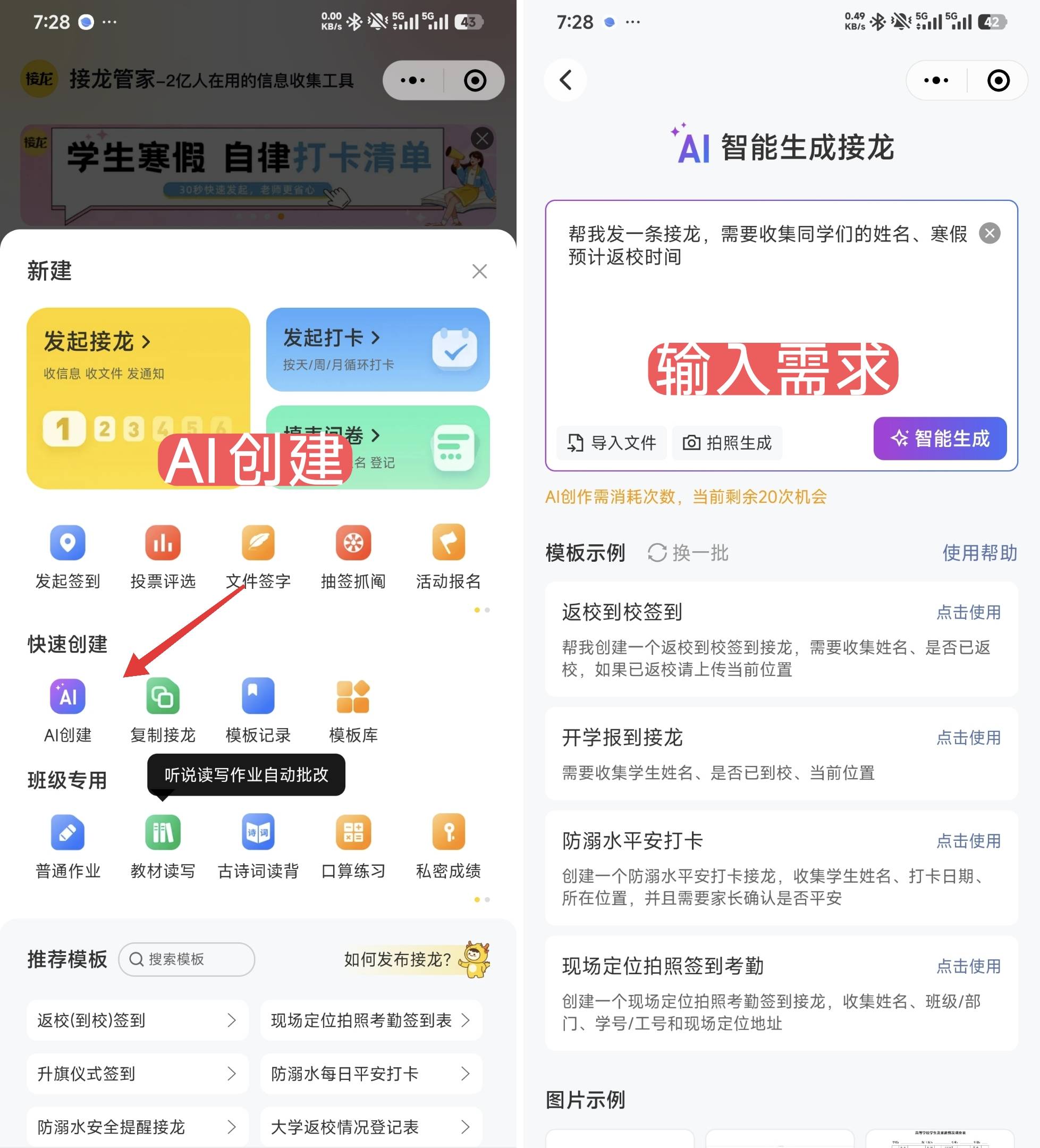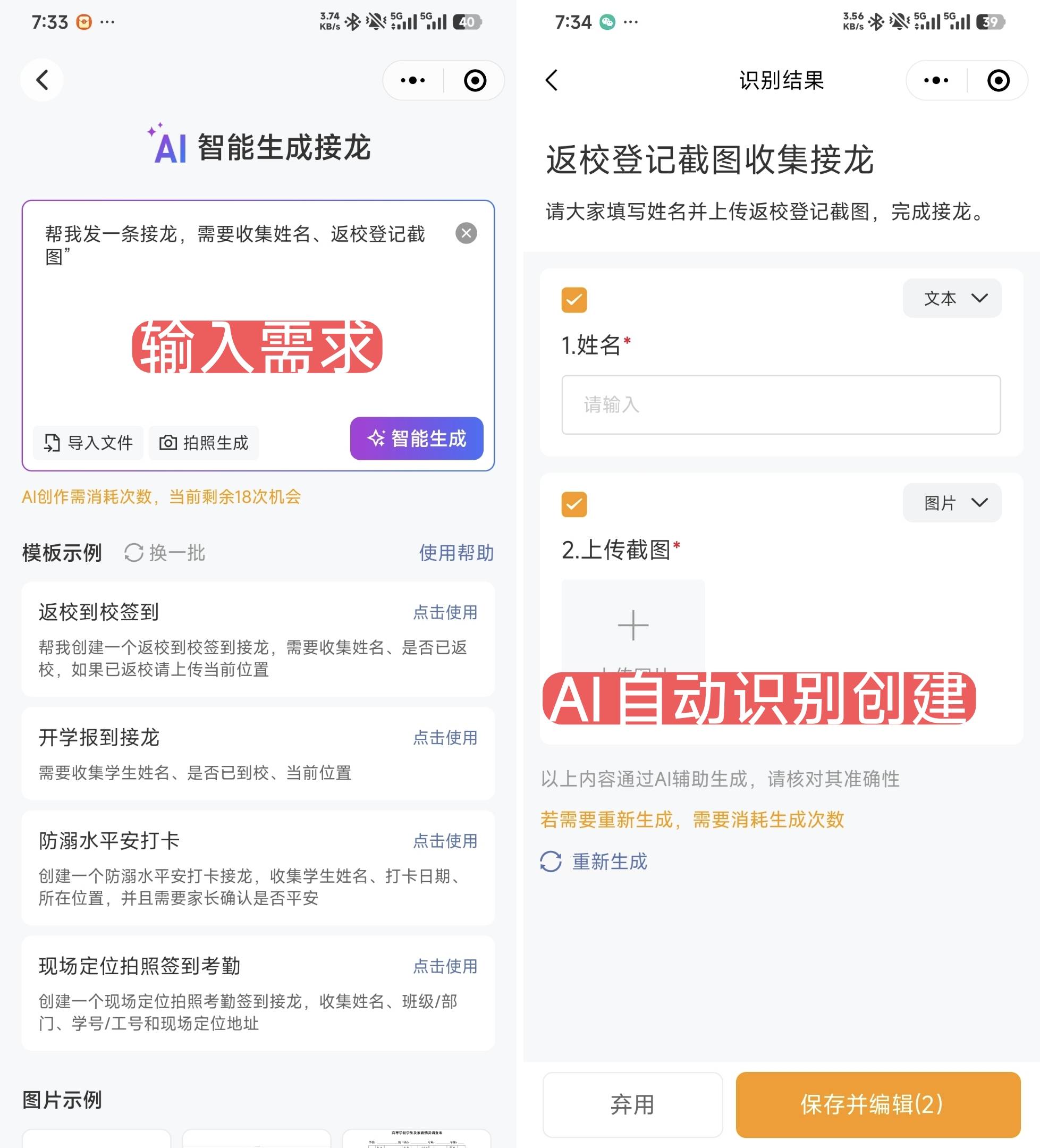 有些高校要求学生先在学校系统填返校信息,再提交截图。这时候只需对 AI 说:“帮我发一条接龙,需要收集姓名、返校登记截图”。AI 5 秒内就能生成接龙表,操作简单到 “手残党” 都能搞定。