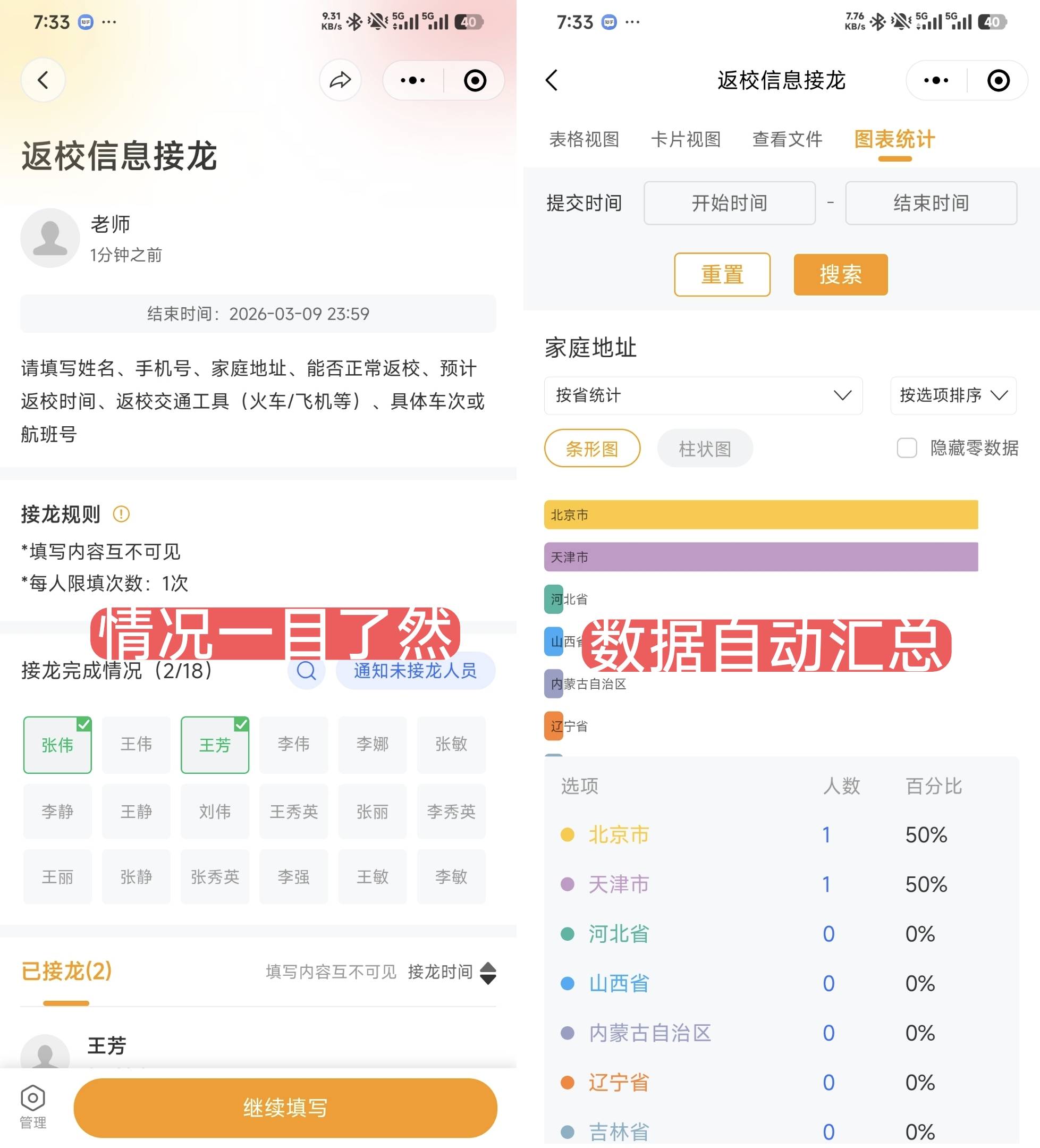 等同学们填完信息,接龙管家会自动整理数据,支持在线查看或直接下载。一键导出全班寒假返校时间的 Excel 表,直接转发给导员,整个流程不到 10 分钟,导员看了都夸效率高!