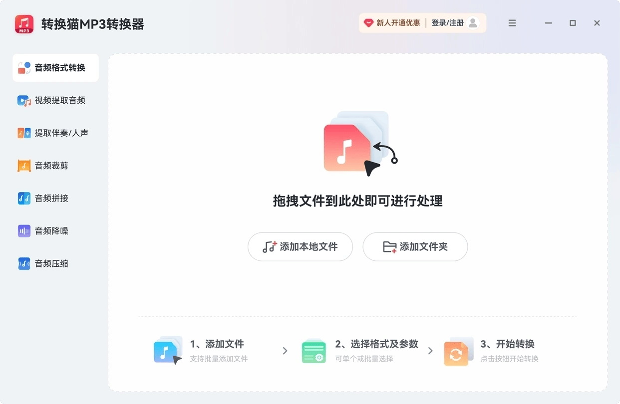 1、电脑上下载并安装“转换猫MP3转换器”『Windows』版。打开软件,点击首页的“音频转换”功能入口。将需要转换的 .m4a 文件直接拖拽进软件窗口,支持批量导入。