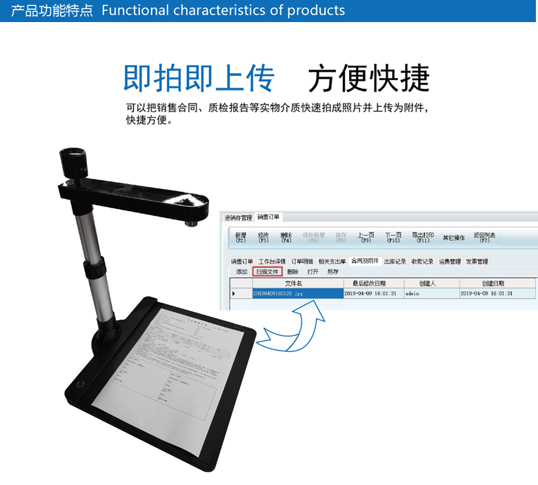 操作简单,实用又高效,一秒拍合同它的操作简单易懂,无需专业技巧,将文件放在高拍仪上,点击“扫描文件”就能生成拍下合同、质检报告等文档,更实用的是,扫描后的文件会同步关联对应业务单据,全程可追溯,方便后续对账、审计,大幅提升办公效率。