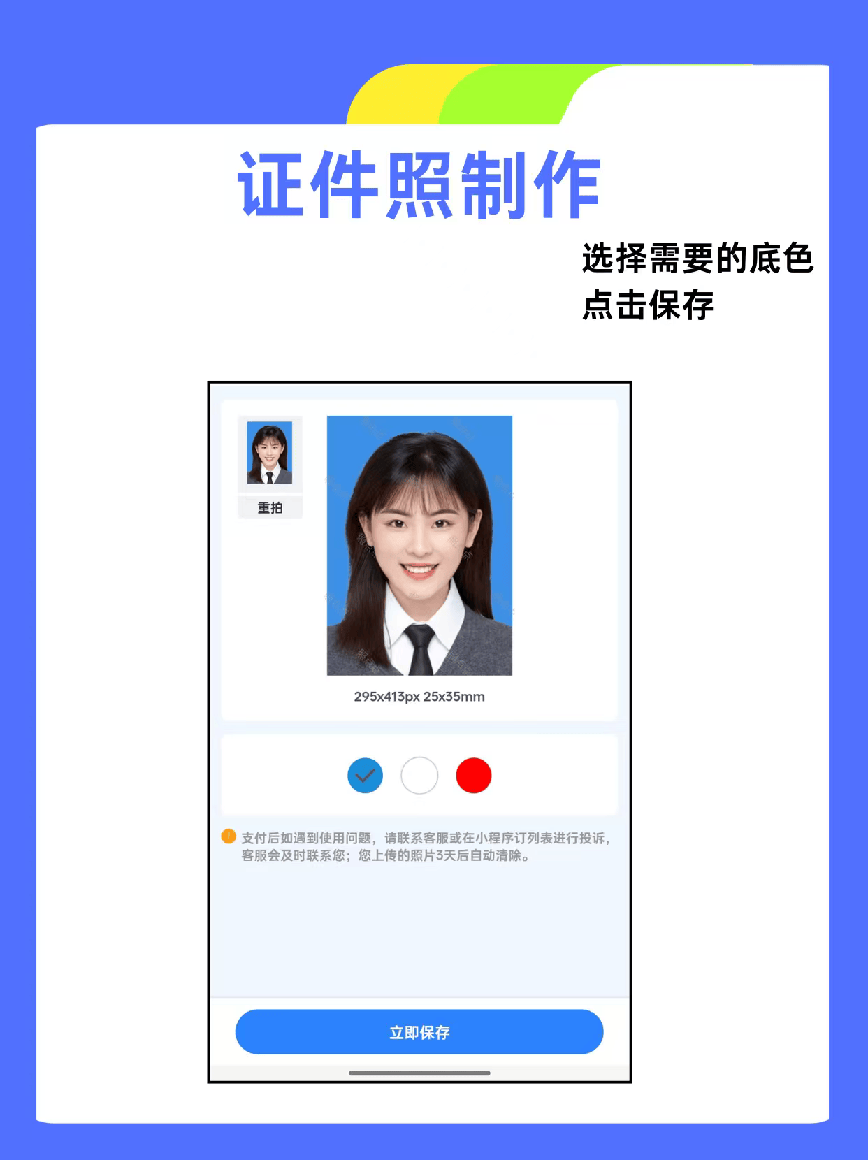 不同场景需要不同底色:白色多用于护照、签证;蓝色适合身份证🪪、毕业证;红色常用作结婚照、医保凭证,根据需求提前选好底色。