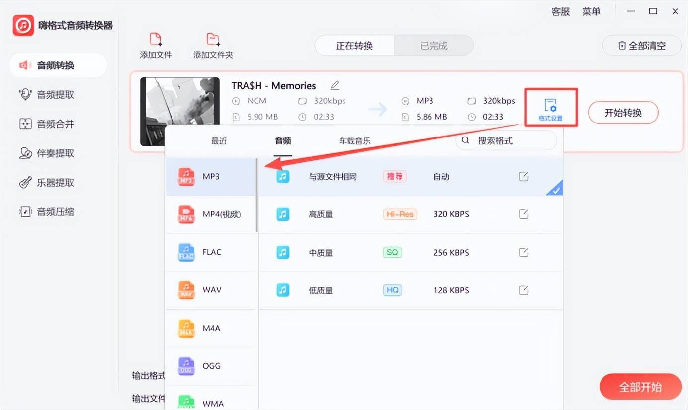 步骤3,设置输出格式为“MP3”,在格式设置中根据需求选择不同的音质效果。