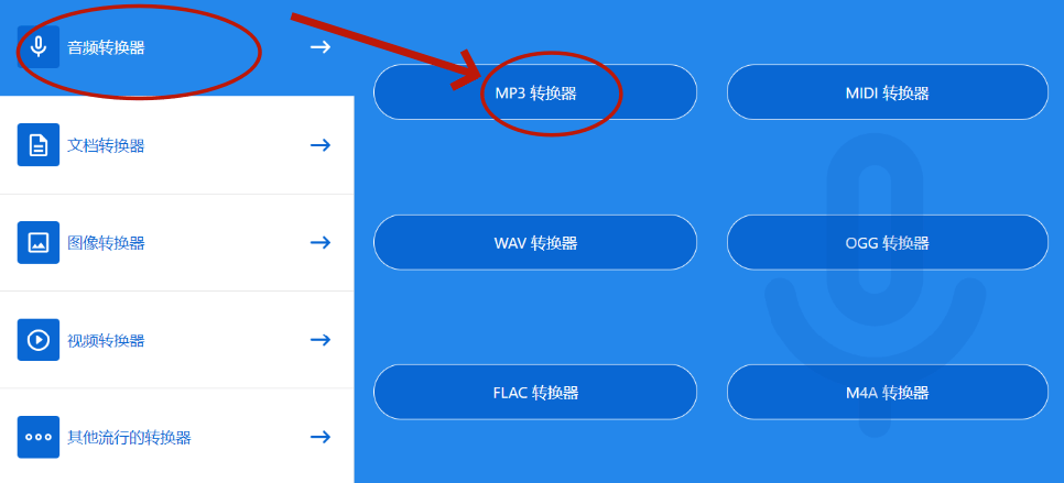 步骤1,打开zamzar在线工具,在主页中选择“mp3转换器”