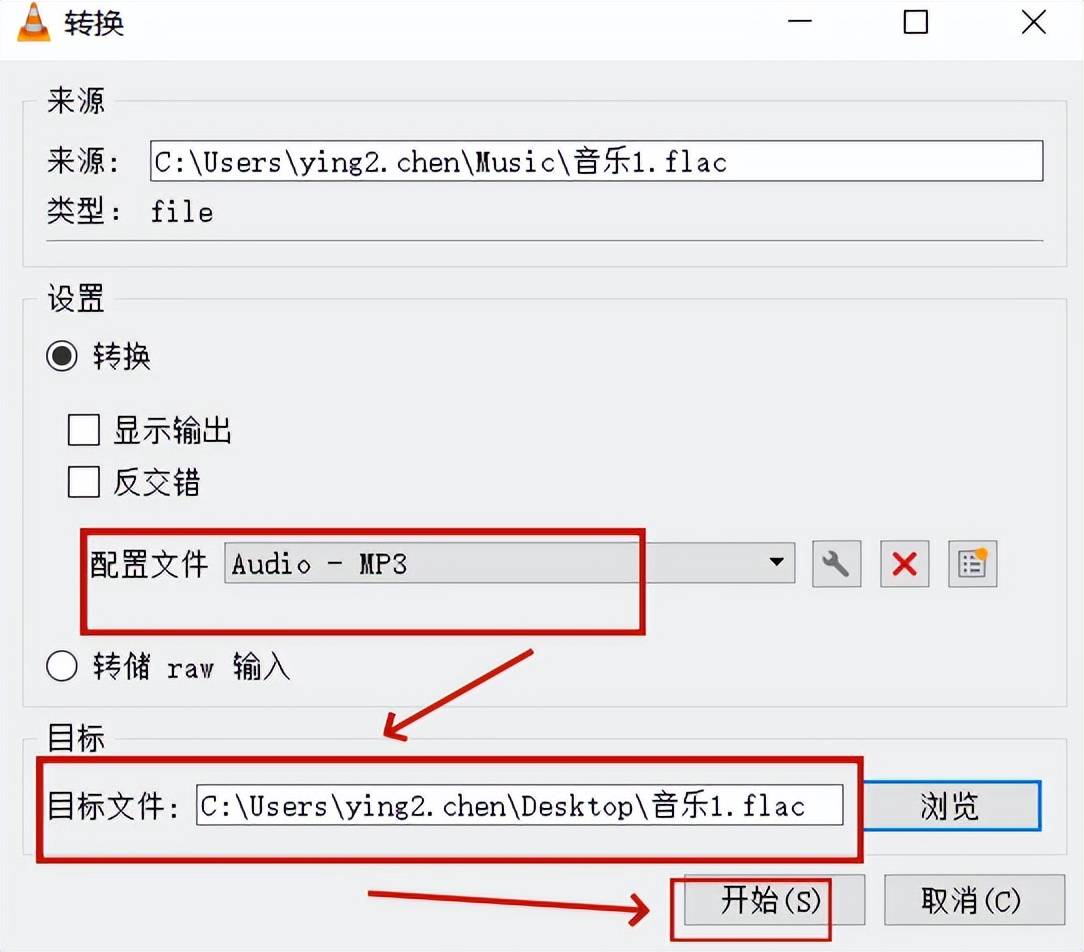步骤3,将配置文件设置为MP3格式,选择文件的保存位置后点击“开始”。