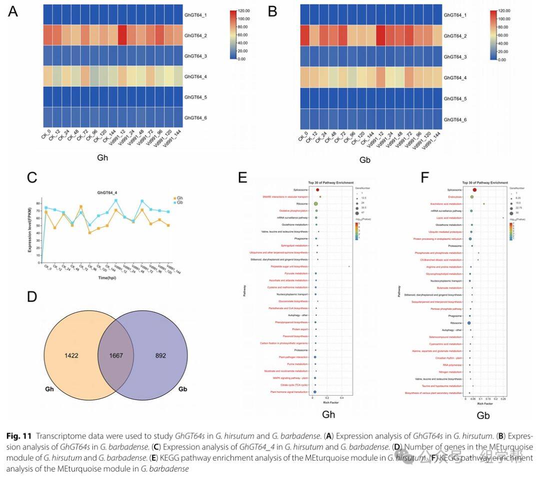 图11(A)展示了陆地棉中GhGT64基因的表达分析结果。图11(B)展示了海岛棉中GhGT64基因的表达分析结果。图11(C)展示了GhGT64_4在两种棉花品种中的表达水平差异,表明海岛棉中该基因的表达水平更高。图11(D)展示了两种棉花品种中MEturquoise模块的基因数量差异,揭示了两种棉花品种在基因表达上的共性和差异。图11(E)和图11(F)分别展示了陆地棉和海岛棉中MEturquoise模块的KEGG富集分析结果,揭示了这些基因在不同棉花品种中的功能富集情况。