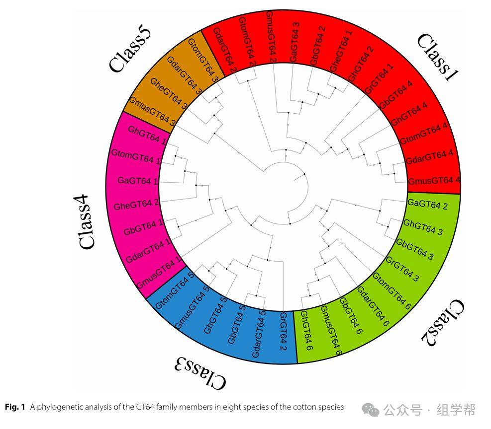 图1展示了八种棉花GT64家族成员的系统发育树。不同颜色代表不同的亚家族(Class1-Class5),每个分支的数字表示该亚家族中的成员数量。图中还标注了不同棉花物种在各个亚家族中的分布情况。