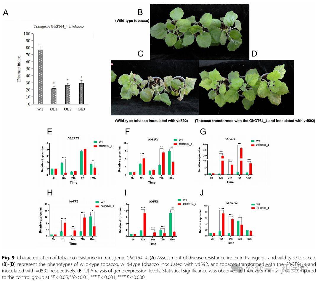 图9(A)展示了转基因和野生型烟草的抗病性指数,表明转基因烟草对大丽轮枝菌的抗性显著增强。图9(B-D)展示了野生型和转基因烟草在接种病原菌后的表型差异,转基因烟草表现出更轻的病害症状。图9(E-J)展示了转基因烟草中与抗病性相关的基因表达水平的变化,表明GhGT64_4能够激活这些基因的表达,从而增强植物的抗病性。