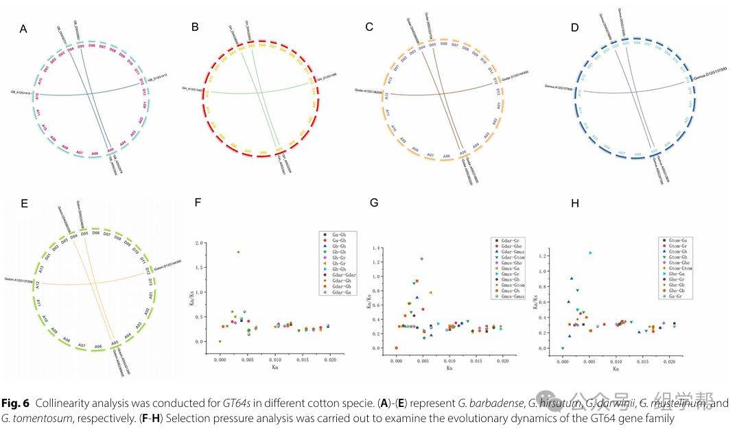 图6(A-E)分别展示了G. barbadense、G. hirsutum、G. darwinii、G. mustelinum和G. tomentosum中GT64基因的共线性分析结果。图6(F-H)展示了不同棉花物种间同源基因对的选择压力分析结果,用不同颜色表示不同的Ka/Ks比值范围。