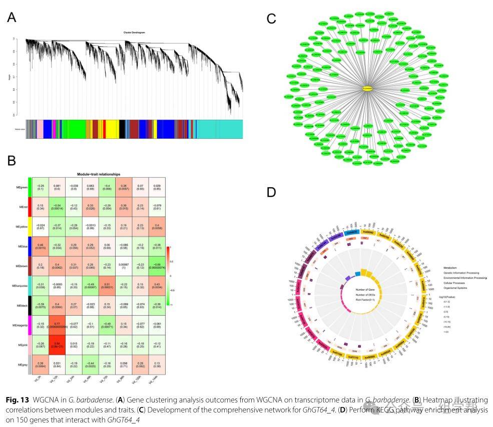 图13(A)展示了海岛棉中基因聚类分析的结果,揭示了不同模块的基因数量分布。图13(B)展示了模块与性状(如接种时间)之间的相关性热图,表明MEturquoise模块与抗病性密切相关。图13(C)展示了GhGT64_4的基因共表达网络,揭示了与其相互作用的基因。图13(D)展示了MEturquoise模块中基因的KEGG富集分析结果,揭示了这些基因参与的主要代谢和信号通路。