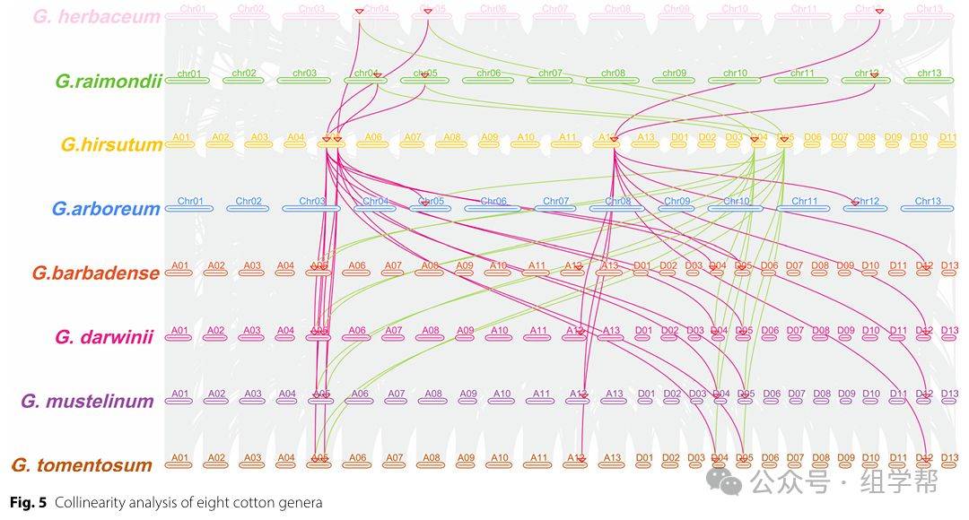 图5展示了八种棉花中GT64基因的共线性分析结果。图中用不同颜色表示不同棉花物种,线条连接表示同源基因对。图中还标注了不同物种之间的同源基因对数量。