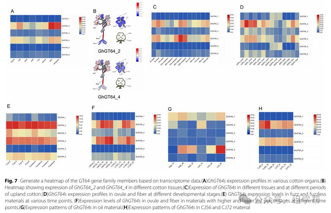 本研究利用转录组数据分析了陆地棉中GT64基因家族成员的表达模式。结果显示,GhGT64_2和GhGT64_4在所有组织中的表达水平均高于其他基因。在纤维发育过程中,这两个基因在早期阶段的胚珠中表达水平较高,而在后期阶段的纤维中表达水平较高。此外,GhGT64_4可能参与陆地棉绒毛纤维的发育,并可能调节纤维品质的变化。GhGT64_5可能负向调控棉花种子中的油分含量。此外,GhGT64_2和GhGT64_4在棉花耐渍、色素腺体发育以及对TDZ处理的响应中发挥重要作用。