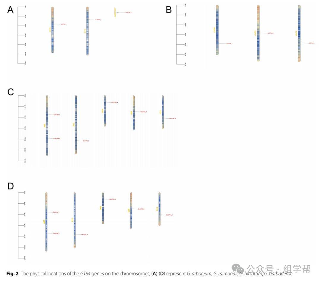 图2(A-D)分别展示了G. arboreum、G. raimondii、G. hirsutum和G. barbadense中GT64基因的染色体位置。每个染色体用不同颜色表示,基因用箭头标注,箭头方向表示基因的转录方向。