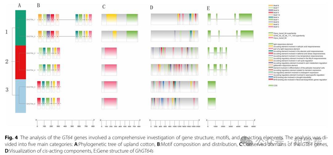 图4分为五个部分:A. 陆地棉GT64基因的系统发育树;B. 基序组成和分布;C. GT64基因的保守结构域;D. 启动子区域顺式作用元件的可视化;E. GhGT64基因的基因结构。每个部分详细展示了基因的特征和分析结果。