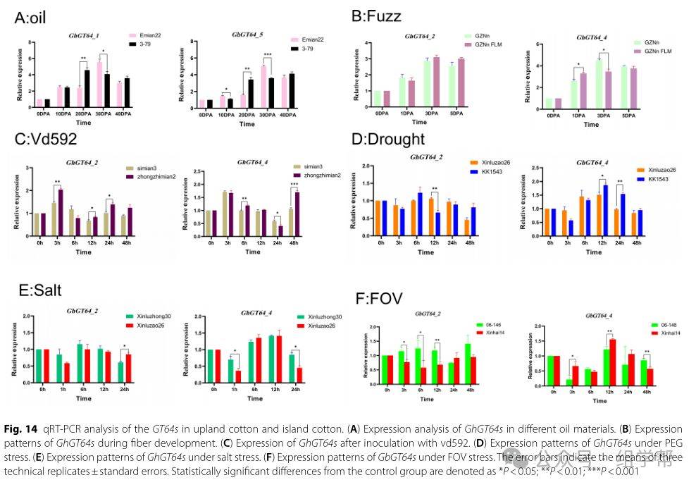 图14(A)展示了GhGT64基因在不同油分含量棉花种子中的表达模式。图14(B)展示了GhGT64基因在绒毛纤维发育过程中的表达模式。图14(C)展示了GhGT64基因在大丽轮枝菌感染下的表达模式。图14(D)展示了GhGT64基因在PEG诱导的干旱胁迫下的表达模式。图14(E)展示了GhGT64基因在盐胁迫下的表达模式。图14(F)展示了GbGT64基因在尖孢镰刀菌胁迫下的表达模式。