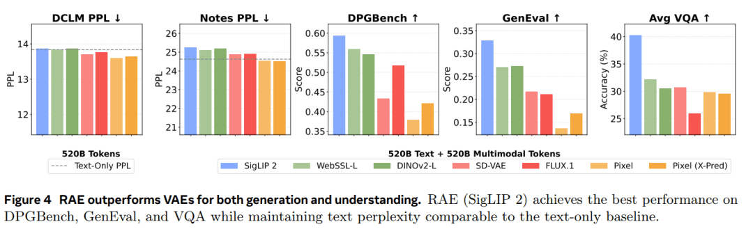建议 1:采用单一的基于 RAE 的视觉编码器(例如 SigLIP 2),可以同时在视觉理解和视觉生成任务上取得优异表现,从而简化模型架构,并且不会损害模型的文本性能。