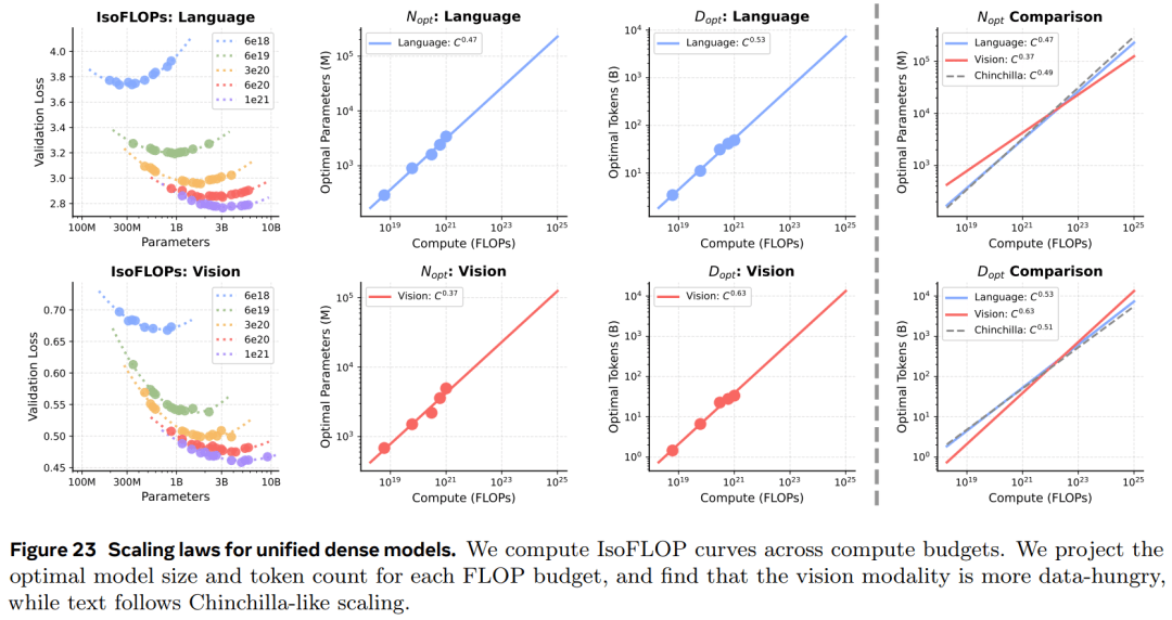 扩展规律(Scaling Properties):通过 IsoFLOP 实验推导了统一预训练过程中视觉与语言的扩展规律(scaling laws)。结果发现存在一种扩展不对称性:视觉任务对数据规模的需求明显高于语言。同时发现 MoE 架构能够有效弥合这种差距。(第 7 节)