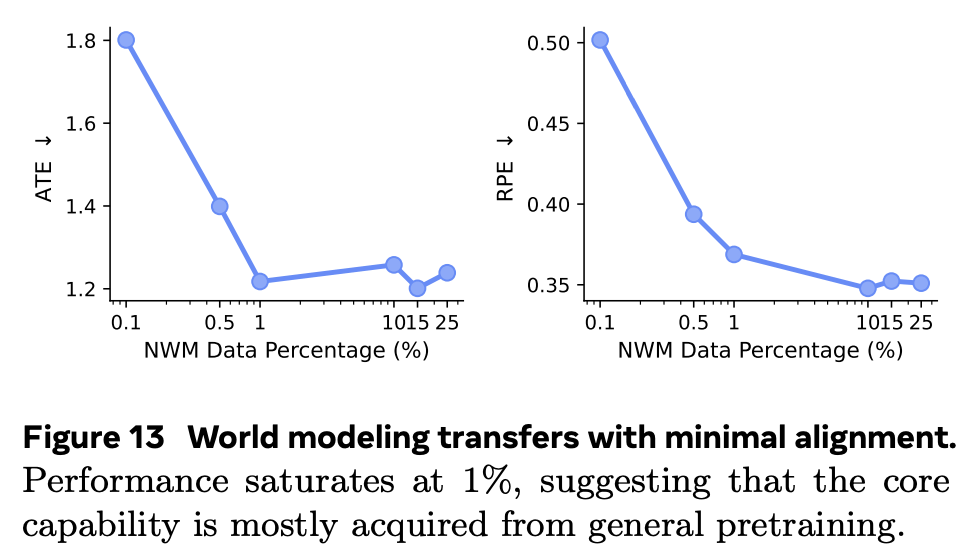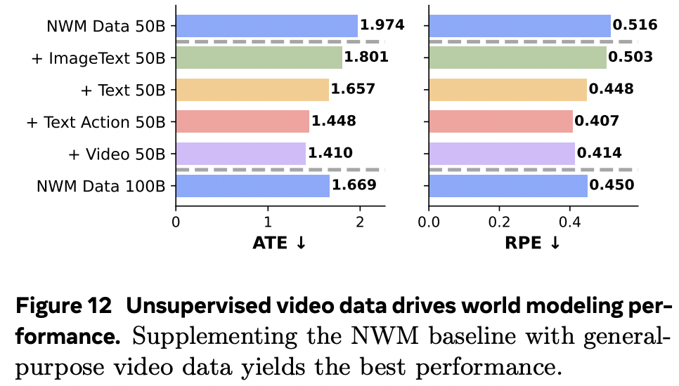具体而言,添加纯视频数据带来的提升最大,但包括 MetaCLIP 和文本在内的所有其他模态也都有所帮助。这表明,世界建模更多地依赖于从多模态预训练中获得的能力,而非特定领域的数据。这与早期研究的发现相吻合。