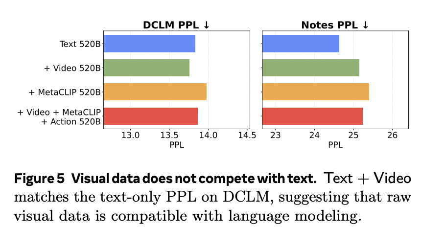 其次,团队还观察到,在所有混合数据中,相对于纯文本基准模型,在分布外(OOD)程度更高的 Notes 语料库上困惑度均有所下降,但相对趋势保持一致。这表明多模态预训练可能会在文本泛化能力上引入微小的权衡(Trade-off)。