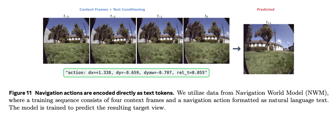 不过,与 NWM 将导航动作(如平移与旋转增量)编码为专门设计的连续向量不同,团队直接将动作表示为标准文本 token。