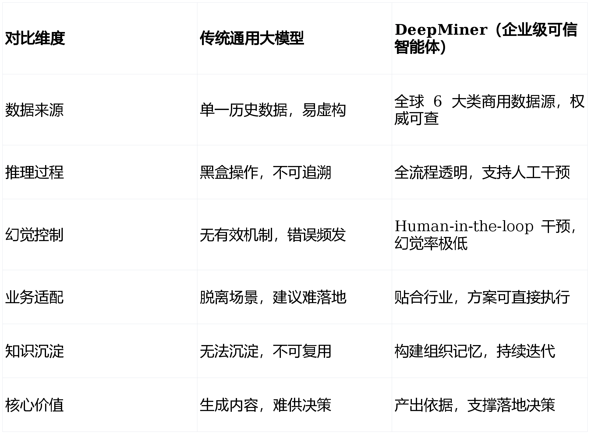 A:通过权威数据源、双模型协同及 Human-in-the-loop 机制, DeepMiner 能将幻觉率控制在极低水平,远低于通用大模型,适配企业商业决策的严苛要求。